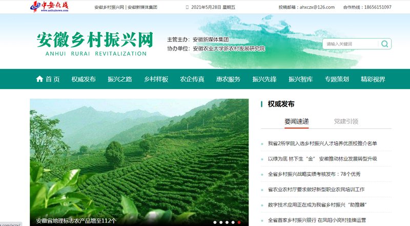 脫貧攻堅取得勝利后,全面推進鄉村振興,是“三農”工作重心的歷史性轉移。在安徽省鄉村振興局5月28日正式掛牌當天,由安徽新媒體集團主管主辦、安徽農業大學新農村發展研究院協辦,以聚焦鄉村振興、服務安徽“三農”為宗旨的《安徽鄉村振興網》(中安在線鄉村振興頻道)也正式開通上線。